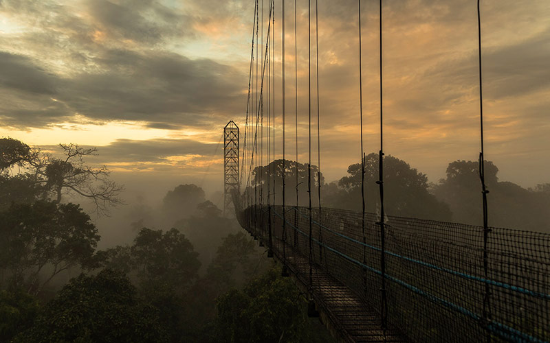 Over the next days, explore the area with your expert local guide. Listen and watch excited technicoloured parrots at a parrot lick, walk forest trails, go caiman spotting at night, paddle the river in dug-out canoes, swim in the lake pool or walk across the treetops on a 94 feet (36 meters) canopy bridge. There is also time for a local community visit, learn about local life and help prepare and sample traditional food.